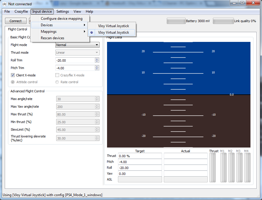 STEP 2: Once done installing VJoy, you can start configuring your custom controls, say for example, the one shown in my screenshot , scrn1 STEP 3: Okay, now for the next step, open the Crazyflie PC Client and go to Input Device > Device and make sure you have selected the appropriate device, as shown in screenshot 2 STEP 4: Configure the device on crazyflie PC client, go to input device > mappings > PS4_mode1_windows. Then go to input device>configure device mapping and configure the device as per instructions from the window. Make sure the correct device and corresponding mapping is selected.