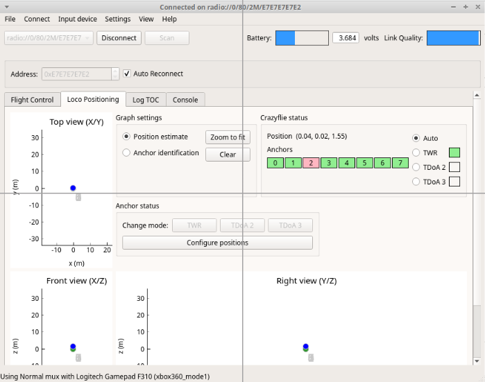 I feel my students and I are getting close. We were able to install the current firmware into the anchors and we assigned each anchor. We set up the anchors and in 1.8 meters x 1.8 meters x 2.0 meters. We are using a USB cable to power each anchor. We start up a drone using a PC Client. When you go to the Loco Positioning Tab and I see Crazyflie status green with all but one anchor. However, we do not see any green dots. I just see a blue dot. Any suggestions on how we can proceed? Thanks