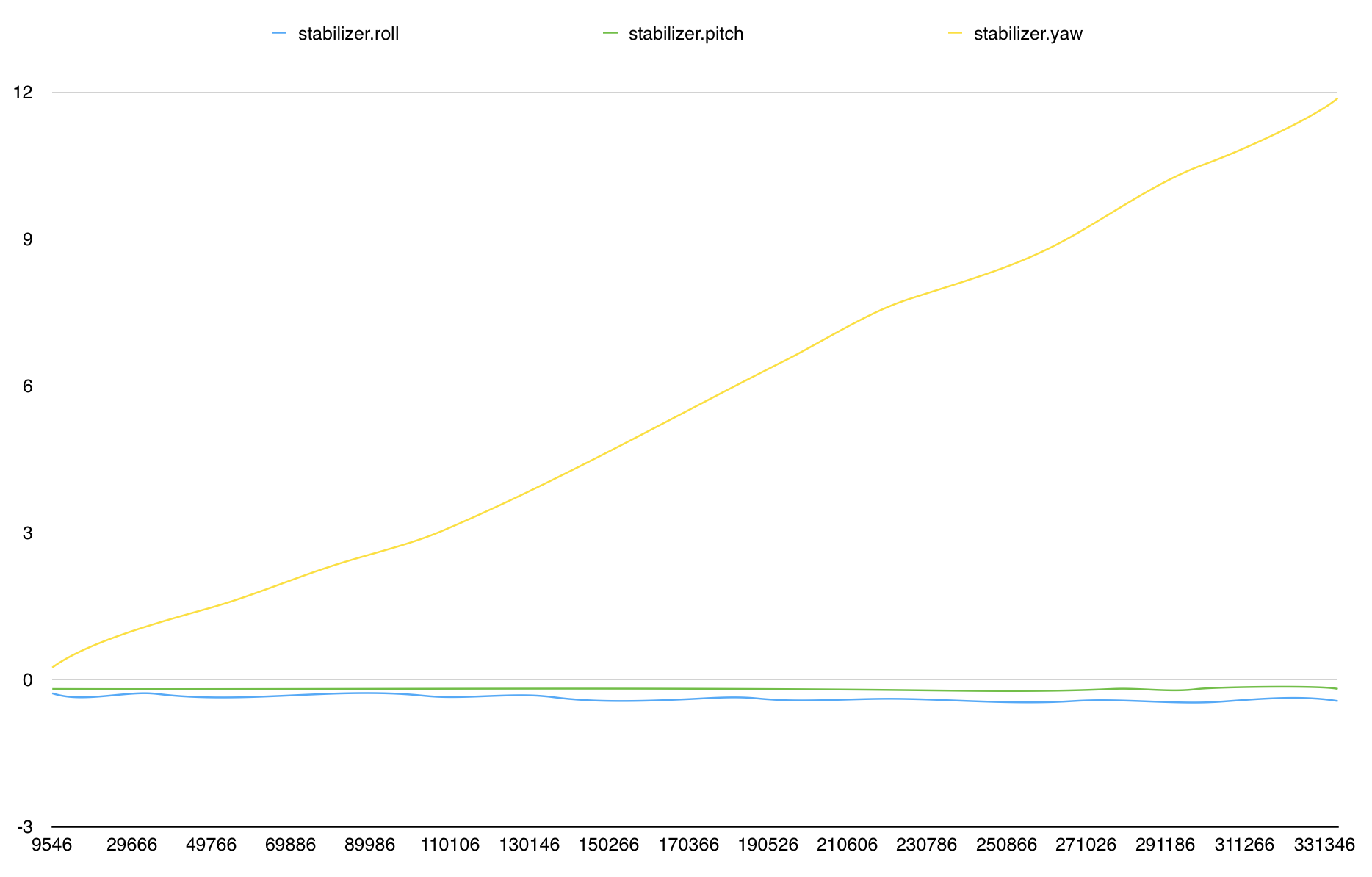 The graph below shows stabilizer.pitch, stabilizer.roll, and stabilizer.yaw. As you can see, pitch, and roll stay pretty close to zero the whole time but yaw... ...well yaw is a little different!