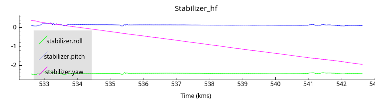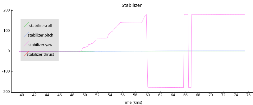 Another graph. The plot of stabilize.yaw shows heavy discontinuities, around 180°. Is it the problem of brutal lost of stability? Regards