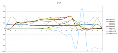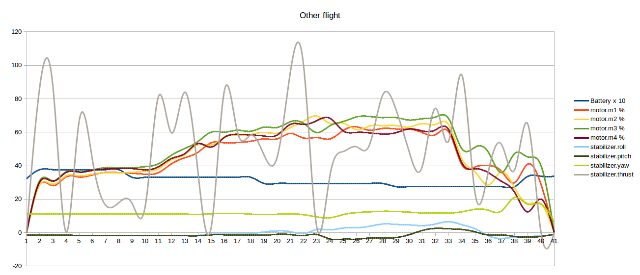You can see the logs of three flights. The first and second are quasi-normal. Le last one ends with a crash on the back. Stabilizer.thrust presents large oscillations...