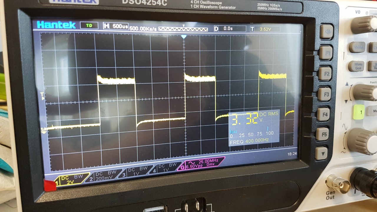 I have followed all the instructions for updating the firmware and getting the Crazyflie 2.1 ready for the BigQuad deck. However, I seem to have a persistent problem. When powering up, the ESCs beep and then the drone says that it is ready to fly (in the cfclient console) and the ESCs beep again. It also says that the BigQuad deck has been recognized and that the driver switched to brushless motors. However, probing the PWM signal with an oscilloscope (picture attached) going into the ESC from the BigQuad deck, there is a signal there and this signal has whatever frequency I denoted it to have (for example 50Hz, 400Hz or 2kHz), but the duty cycle is not changing at all, no matter the thrust input given through the gamepad. Is there something simple that I am missing? As I have looked through the forum and found similar issues, but no answer.