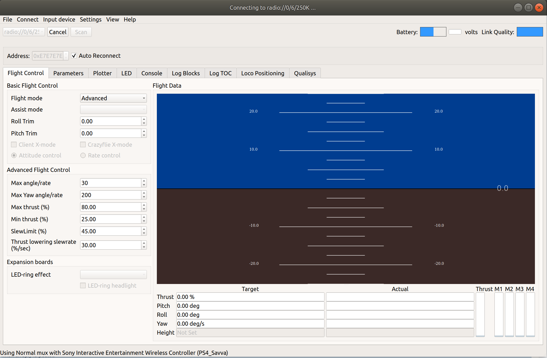 After that I restarted the drone; when scanning for devices, the drone pops up. When I hit connect, the GUI says that it's connecting to the radio, but it never actually connects (it just states that it's "connecting to radio"). Interestingly, at this point I can control the drone with the joystick; but I don't get any Flight Data back.
