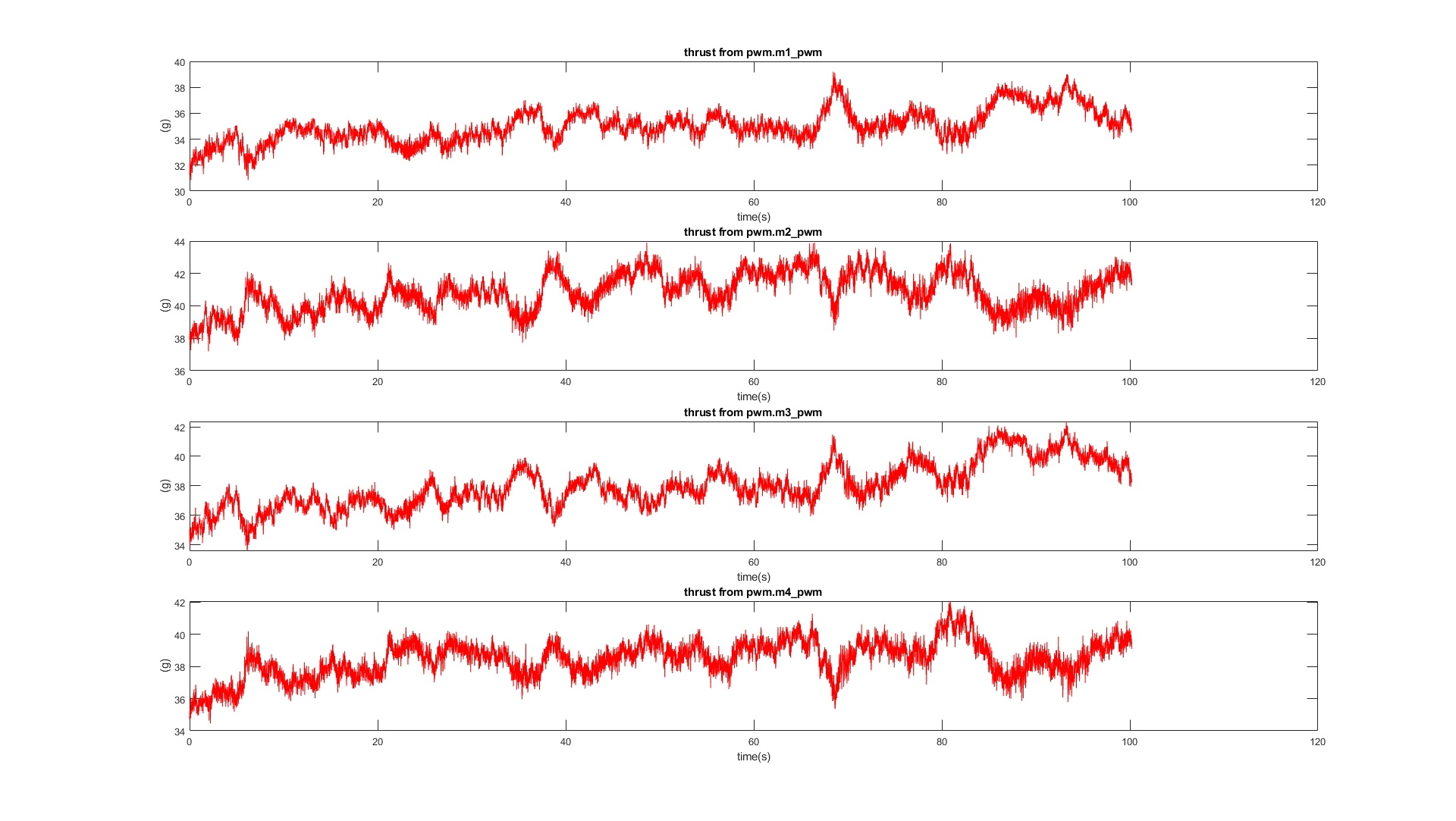 I put the thrust vs pwm plot in the attachment. According to the plot, the thrust from each motor is different, also they all greater than 30g(if this is true, the total thrust is greater than 30*4=120g? I don't believe that). is there anything that I do it wrong?