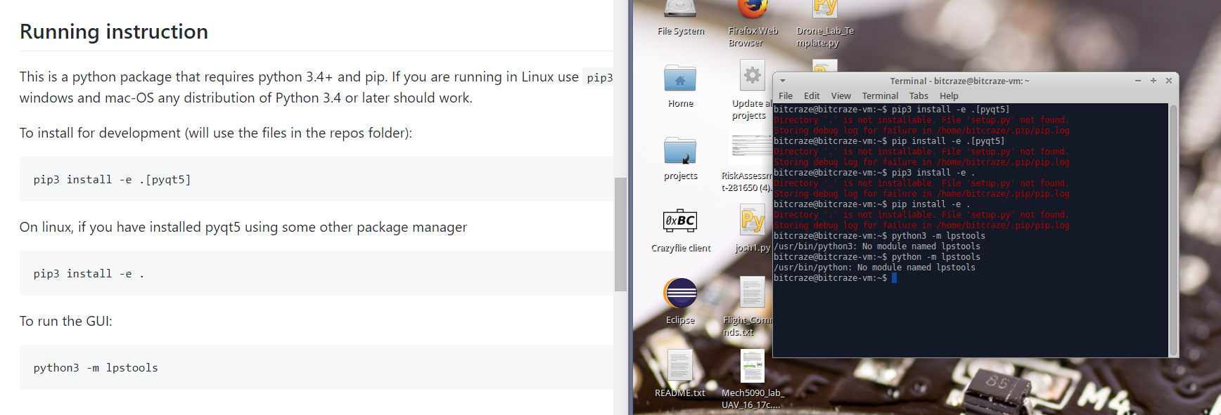 The pip commands where not required for the VM (since it already have the client installed), but anyway they need to be run in the crazyflie clients folder (you need to 'cd' in the project folder).