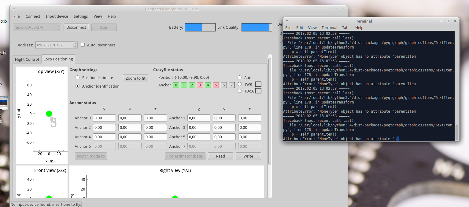 - The location of the Crazyflie seems to eventually increase to X=10.00, Y=10.00 if you move it in any direction, i.e. the coordinates seem to only work in one direction.