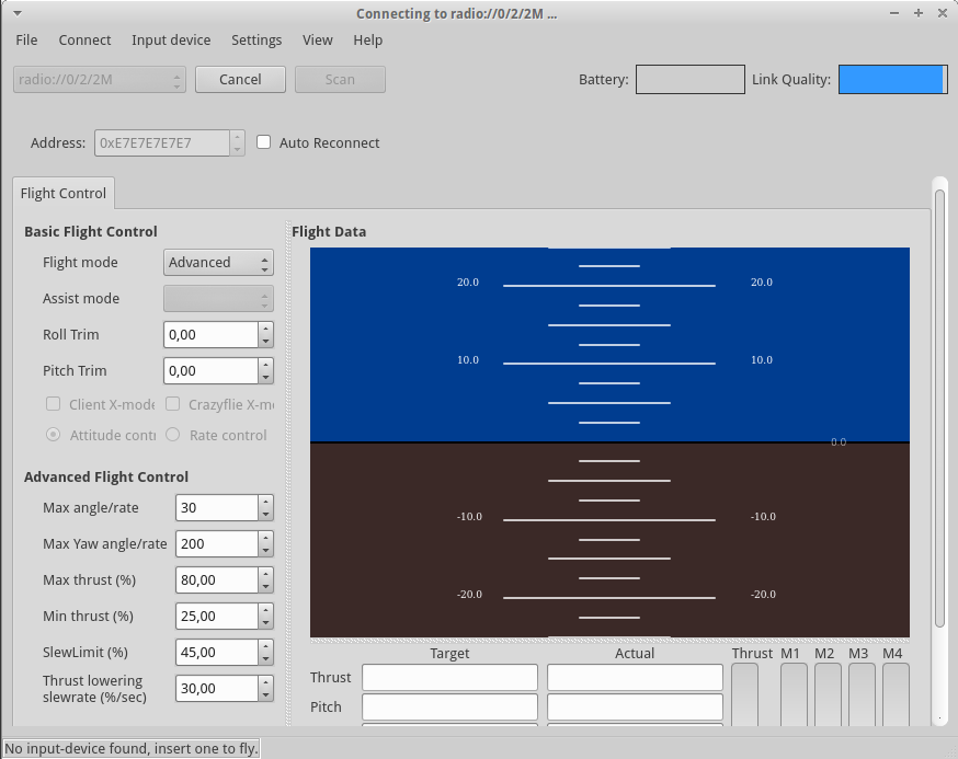 Okay, I've gotten through most of the "Getting Started with Crazyflie 2.0" instruction successfully this time. However, I run into problems when I try to actually click the "Connect" button within the Crazyflie Client on the VM. I have attached a screenshot of what the window looks like. As you can see, it says "Connecting to radio://0/2/2M ...", which would seem to indicate that it is in the process of connecting, however it never goes any further than this. Also, there appears to be an input for 'Link Quality', which is almost at full, but none of the other telemetry fields seem to be coming through. Is there something I can do to fix this? I have also attached a screenshot of the 'About Crazyflie Client' window to help diagnose any issues.