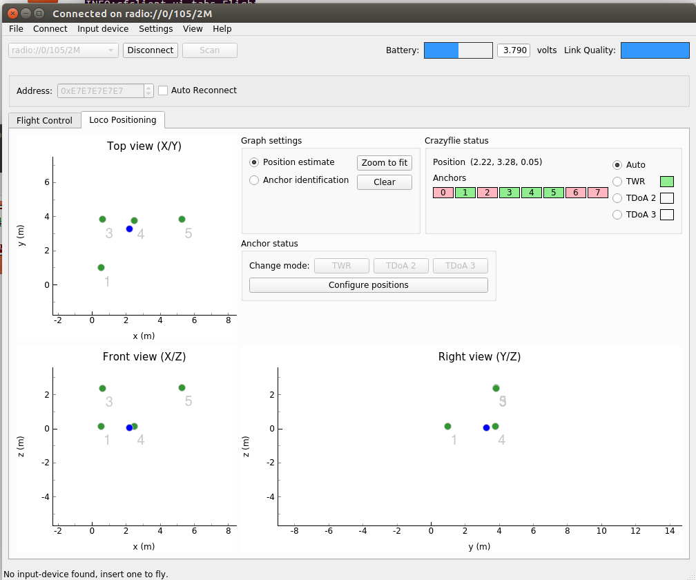 When the CrazyFlie is turned on it syncs with all the nodes (and the leds are blinking for some seconds). I can also see the nodes as green in the CF client (see the image).