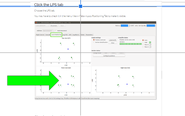 I feel my students and I are getting close. We were able to install the current firmware into the anchors and we assigned each anchor. We set up the anchors and in 1.8 meters x 1.8 meters x 2.0 meters. We are using a USB cable to power each anchor. We start up a drone using a PC Client. When you go to the Loco Positioning Tab and I see Crazyflie status green with all but one anchor. However, we do not see any green dots. I just see a blue dot. Any suggestions on how we can proceed? Thanks