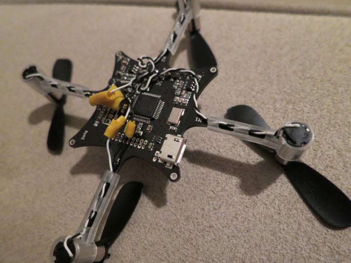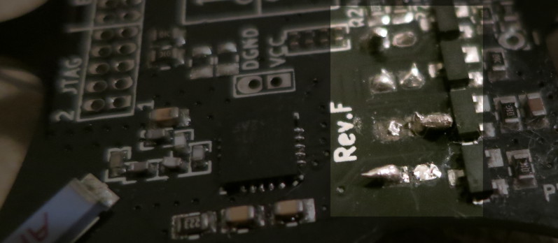 Photo of the underside where I clipped and soldered the motor wires, instead of touching the PCB again. Covered up with electrical tape: