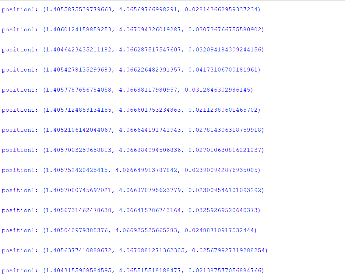 I'm trying to log data from two crazyflies, I took as an example (not sending sequence) swarmSequence and started the log and configuration for position printing. However when I print the position there are two issues: the data received does changes but only decimals (picture attached) even though the drone is changing position (does this has something to do with the fact that I didn't use SyncLogger? if not, is SyncLogger just to synchronize the data received data), second issue is that one of the drones does not return the right position (they were near each other could that affect it?)