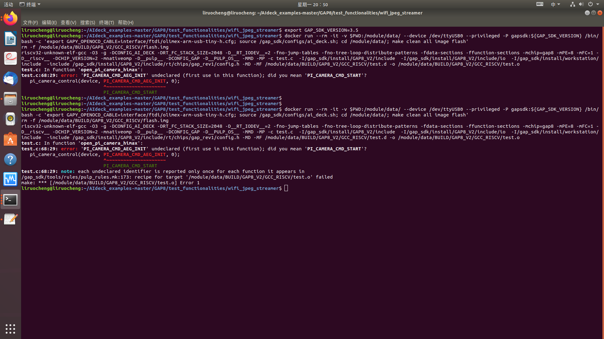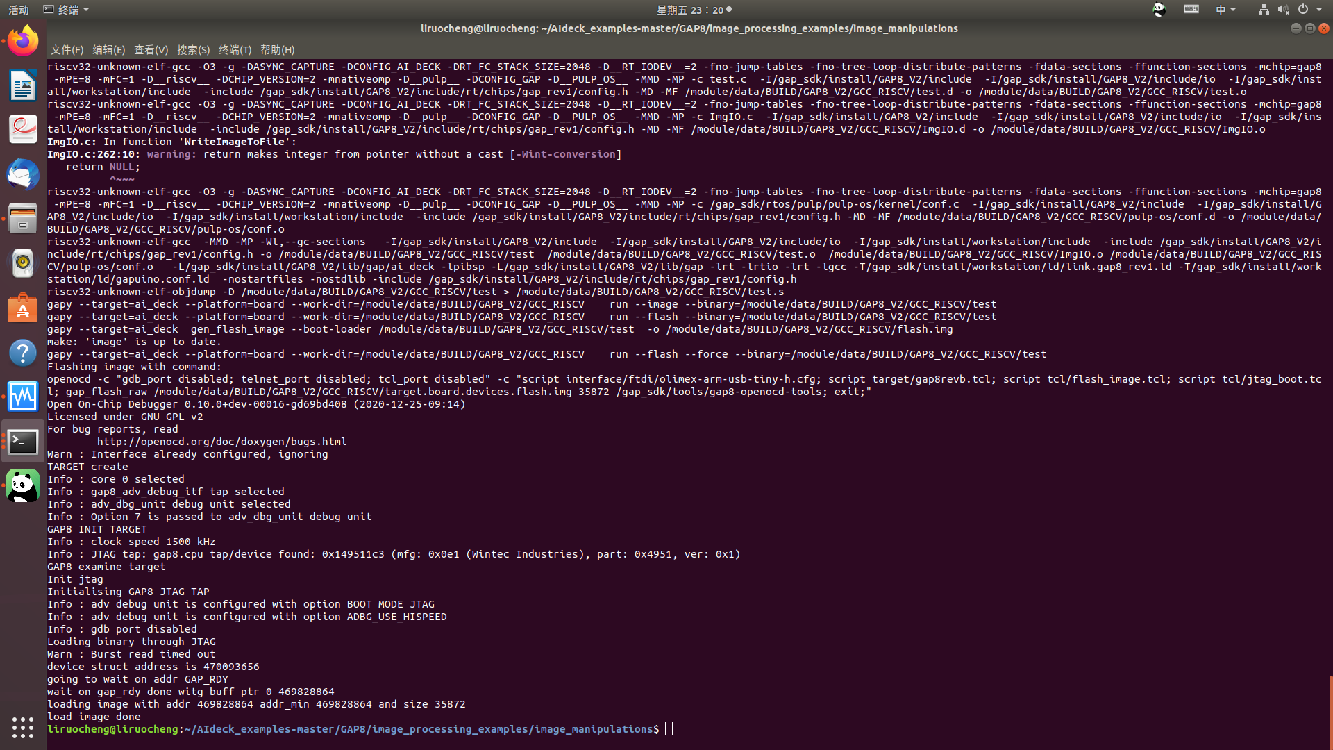 docker run --rm -it -v $PWD:/module/data/ --device /dev/ttyUSB0 --privileged -P gapsdk:${GAP_SDK_VERSION} /bin/bash -c 'export GAPY_OPENOCD_CABLE=interface/ftdi/olimex-arm-usb-tiny-h.cfg; source /gap_sdk/configs/ai_deck.sh; cd /module/data/; make clean all image flash'