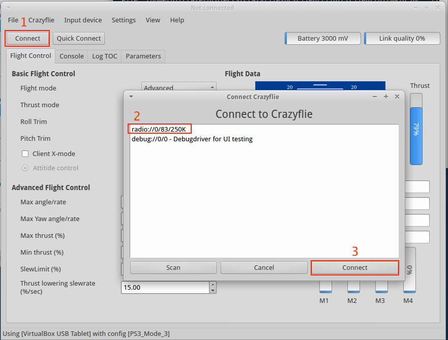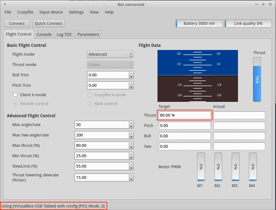 A quick note: please check the thrust setting before connecting to the Crazyflie. If your controller hasn't been connected properly, the desired thrust value can be set to 80% when you connect, which will cause your flie to rocket upwards without you meaning it to! It's happened to me before - the photo below shows what I mean.