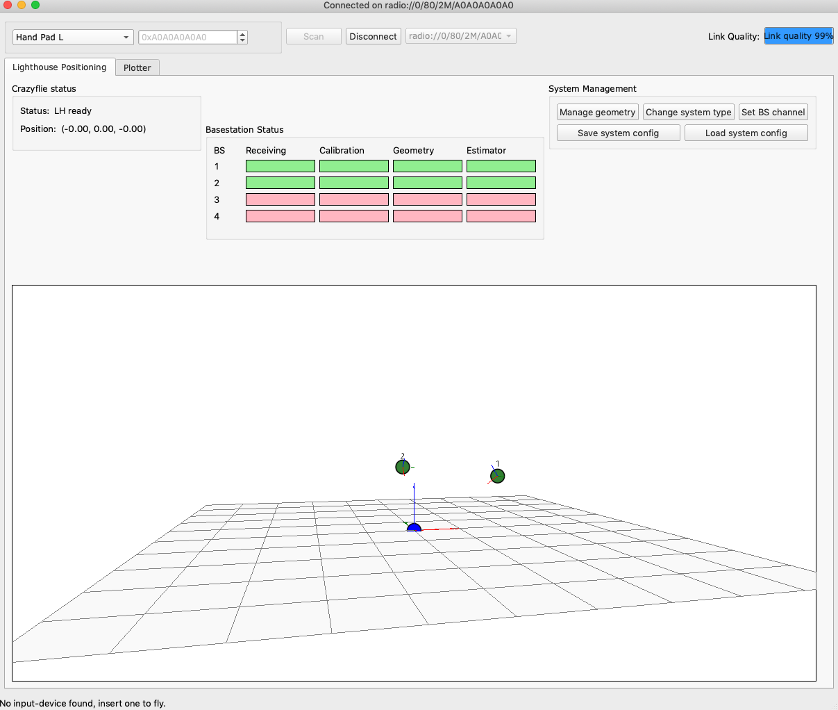 In this test each drone was 1.2m below the BS's. 1.8m away from the BS's and directly in front of the BS's. There were 2 BS on at the time. Channel 1 and Channel 2. The Lighthouse deck is mounted on top of the drone and is pushed all the way up to the top of a set of extra long pins (I assume this is the best way to ensure the deck is paralell with the chassis as the pins are pushed all the way into the drone). The Crazyflie was flashed, then the estimate geometry button was pressed and the values written to the crazyflie. These screenshots were taken after the 500 sample slots were filled (about 5 sec after starting the plot).