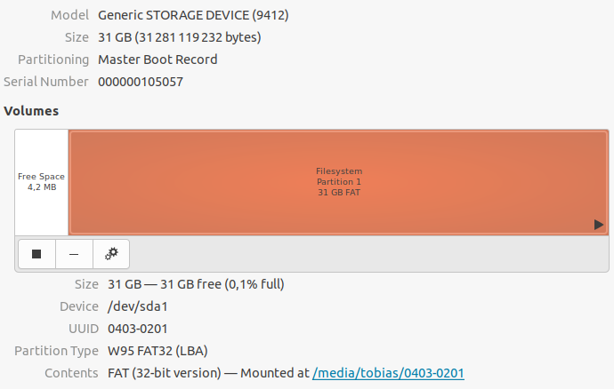 In fact I bought a brand new 32 GB Class 10 Philips SD card in order to avoid problems of too slow SD cards (following your suggestion here). However, I only got a "uSD: mount SD-Card [FAIL]." in the console when using this card. The only relevant issue for that I've found is here, where the solution is to format it correctly. Unfortunately, I think my new SD card is formatted in the exact same way as my old one (as suggested by the enclosed screenshots). Maybe you have another suggestion to that.