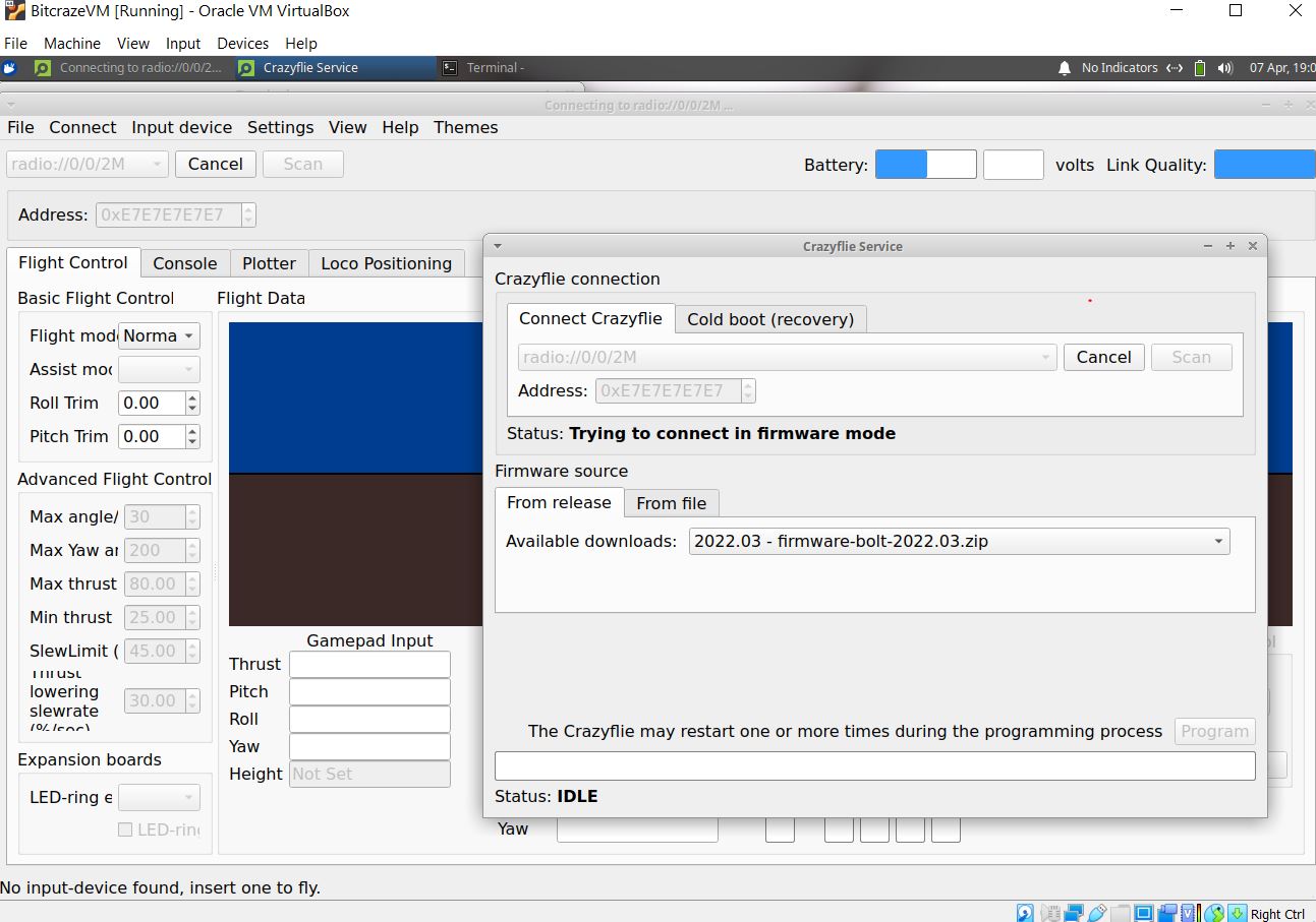 Also, I see from your picture that you are using the virtual machine in virtual box. Have you made sure that the USB extension plugin was installed like in the =https://www.bitcraze.io/documentation/ ... structions? Also have you tried to install the cfclient locally? The cfclient could be installed natively on windows, ubuntu and mac too as have heard more people that are having difficulties with the VM.