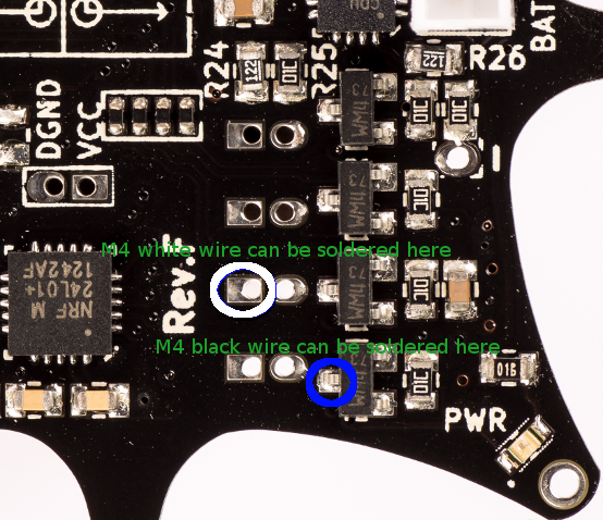Motor 4 is currently not soldered to the pads. The other motors has about 2,3 ohm in resistance. M4 has 1,7 in resistances but again, the motor is not connected.