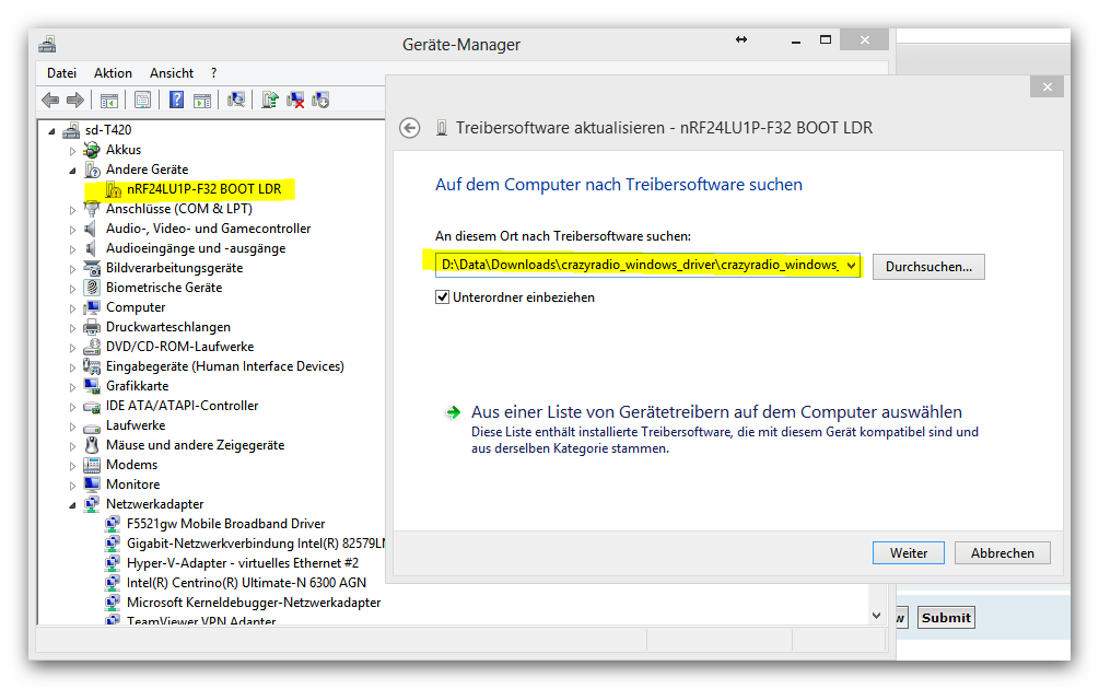 I tried to install python etc. like it is described here http://wiki.bitcraze.se/projects:crazyf ... ls:install. Python is running the windows path is set, installing PyUSB 1.X went well i think, for pyGame i used the pygame-1.9.2a0.win32-py2.7.msi from here http://pygame.org/download.shtml (hope this work as good as the .zip above?), now i don't know what to do with the libusb and where to find the "pc_util/crazyradio/" folder with the "launchBootloader.py" file and the "nrfbootload.py" file. I also searched for the firmware to flash on bitbucket, but don't find any.