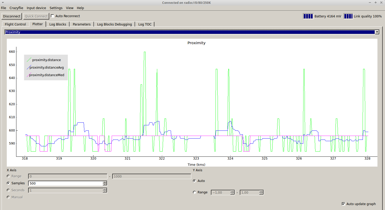 Log group "proximity" available (disabled by default in proximity.h). See attached image showing the log group (data from the LV-MaxSonar-EZ4) in the plotter view of the cfclient, with unprocessed values (green), average values (blue) and median values (pink).