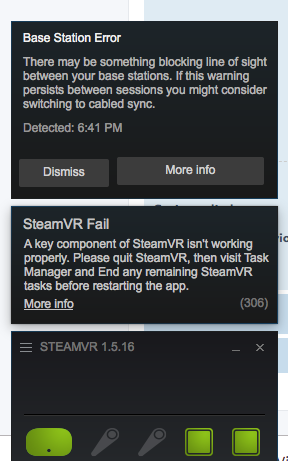 1. The message you get from steamVR is caused by the lighthouse base station not seeing each-other reliably. You should make sure your base station have good line of sight to each-other or use the sync cable and set the base station in mode A and B. Any other failure should not matter for Crazyflie, and you do not need to keep steamVR running to fly Crazyflie.