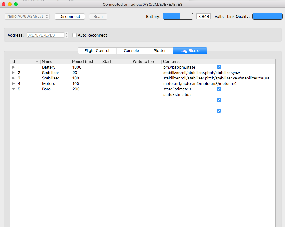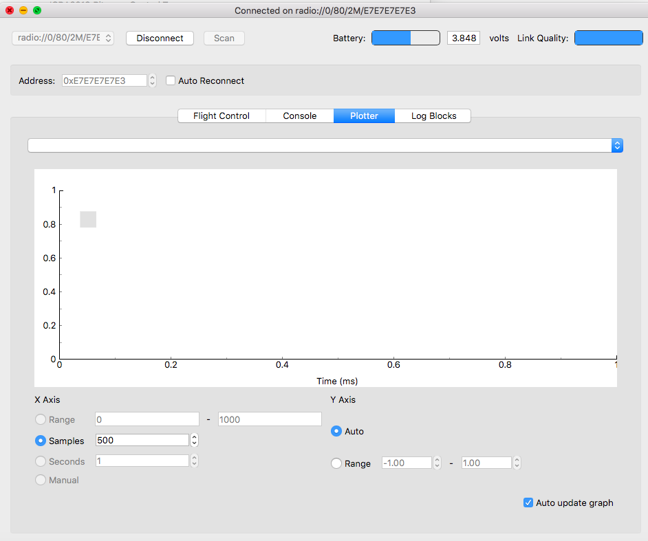 2. You need to add a log block as documented there: https://wiki.bitcraze.io/doc:crazyflie: ... ex#logging. Once you have added the log block with the variables stateEstimate.x/y/z. Once the log block is created, it will appead in the list of log blocks and in the plotter list: https://wiki.bitcraze.io/doc:crazyflie: ... ex#plotter.