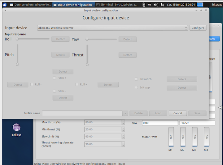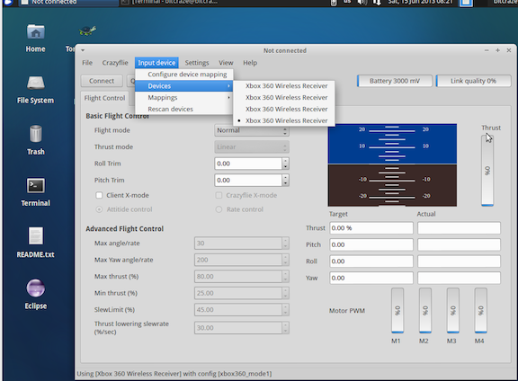 12. Test the controller (do not connect the CF yet!). When you push the sticks you should see the values in the "Target" column under the horizon and the Thrust-bar change.