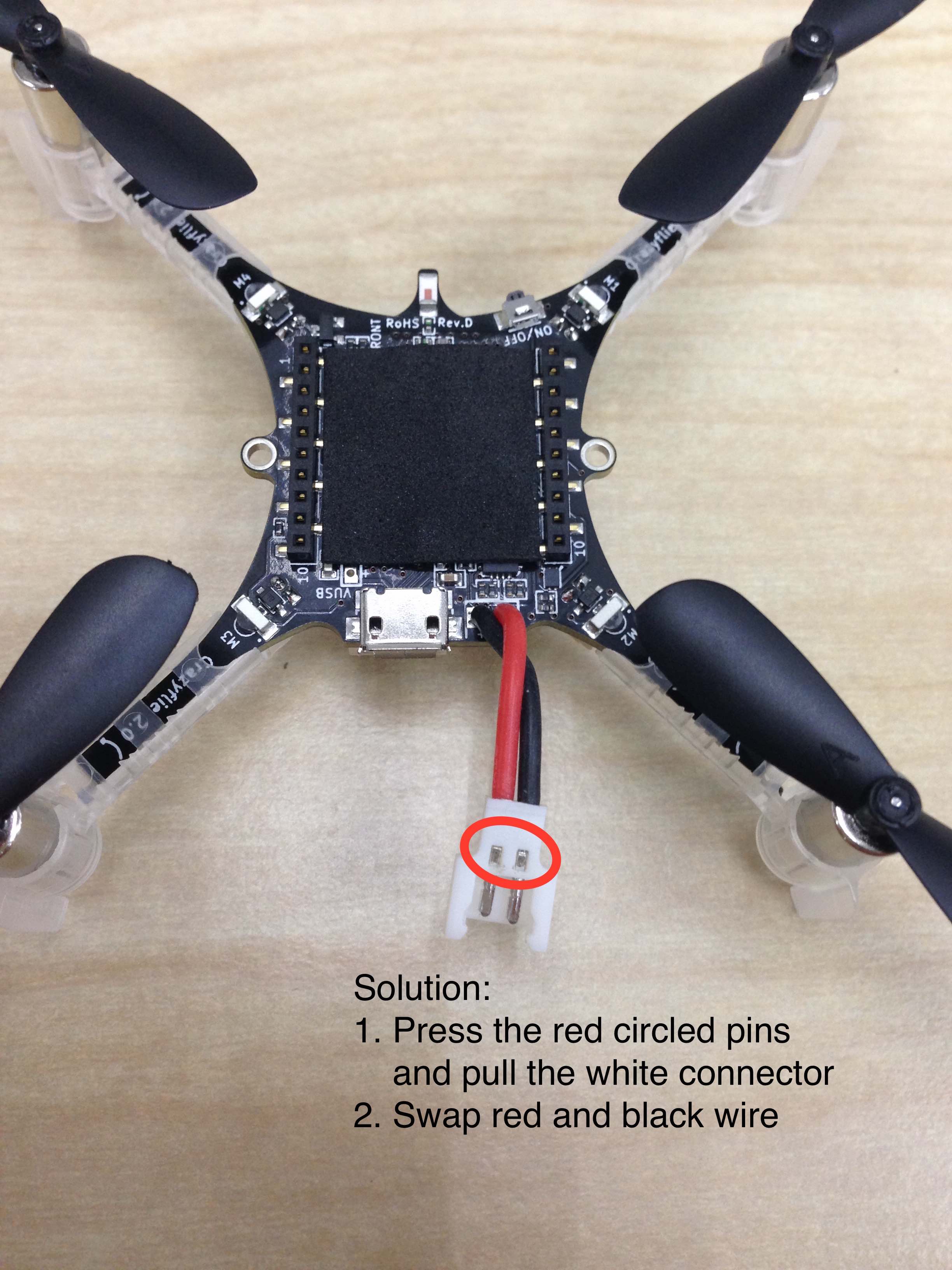 Looks like a production error. The positive and negative on the battery cable has been soldered wrong. As a first step you can swap the pins in the connector and test but of that doesn't work send us an email at support@bitcraze.io.