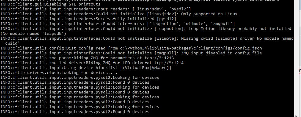 How do I enable ZMQ for my crazyflie? I've edited the config.json file to enable ZMQ input, but everytime I ran cfclient it shows this message