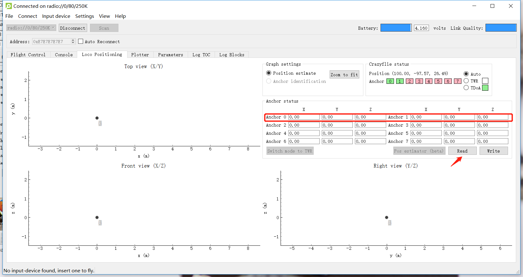 with 1 crazyflie2 and 2 locopositon node, client tab loco position set the every anchor's xyz then write ok, but when press read button result in all anchor's xyz return 0. why ?