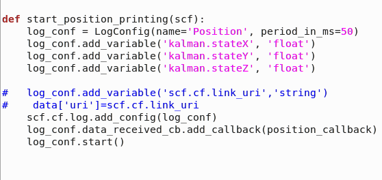 Hi, I am using python to run the crazyflie. And I was using those code to get the position information of the crazyflie. And the data I got were the data from all of the crazyflies together and I could not classify them, so I just want to know how get the uri information for each data I got.