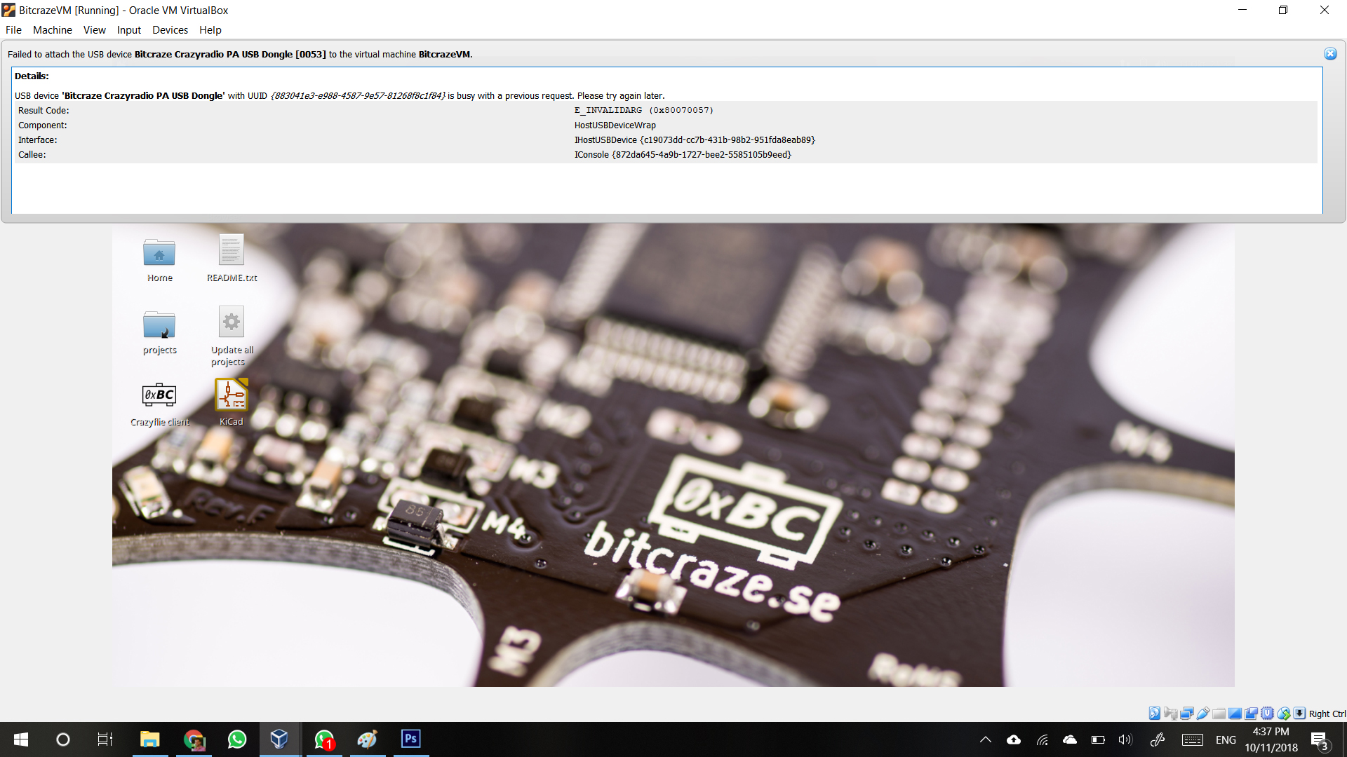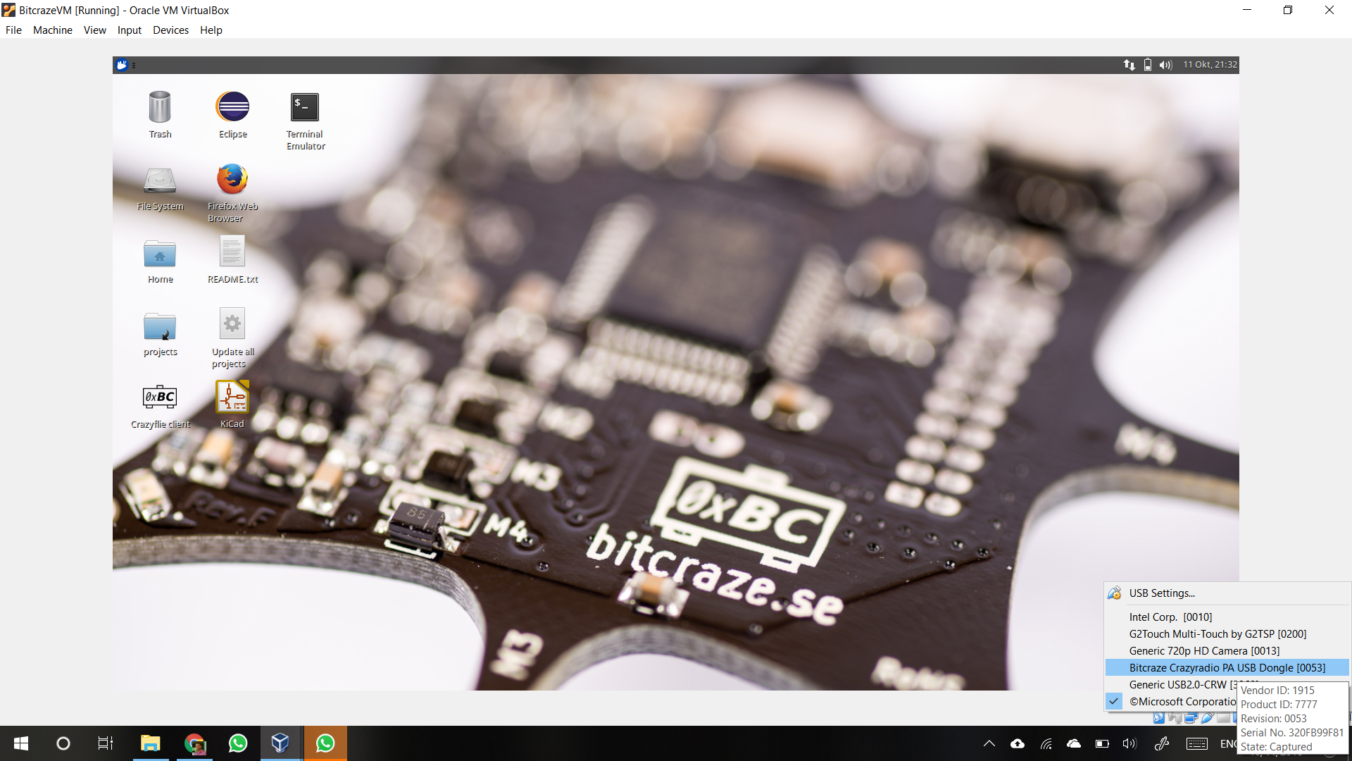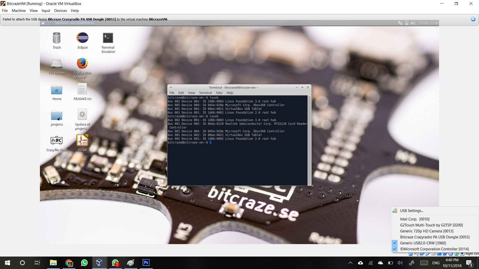 However, when I open the VM on Virtualbox, things no longer work as suggested by the tutorials. With the Crazyradio PA connected, I click the USB icon on the bottom right of the VM screen and try to select the Crazyradio PA to no avail.