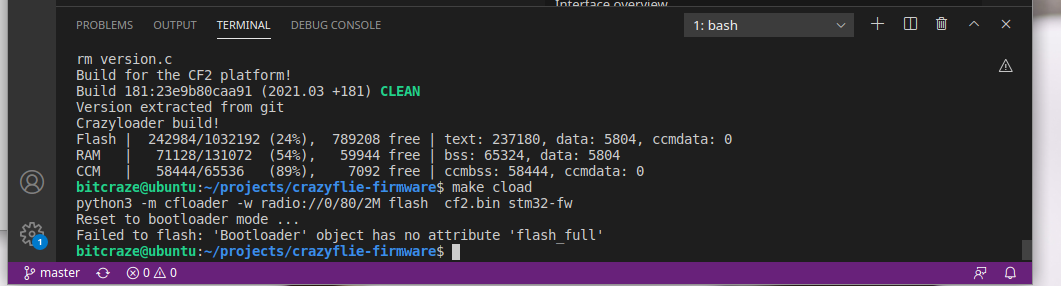 I am trying to follow the documentation with getting started with development. I am getting the following error (as seen in picture below) when trying to cload. I am performing 'make' and 'make cload' in the projects/crazyflie-firmware folder. In addition the crazyflie is in bootloader mode( I make sure to hold power button for 3 seconds until M2 and M3 blink).