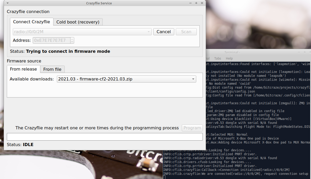 In addition, in the crazyflie client, when I try to use bootloader, I get the message "Trying to connect in firmware mode" and it gets stuck on this message. (See bottom picture)