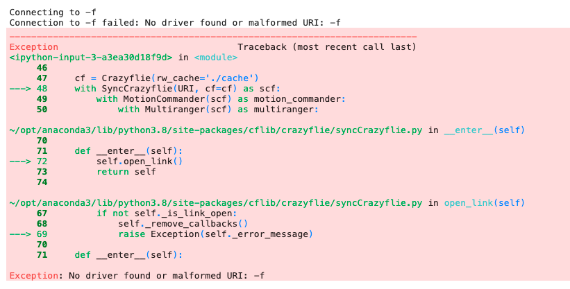 When trying to fly a Crazyflie using the multiranger_push.py code (found here https://github.com/bitcraze/crazyflie-l ... er_push.py), the code prints "Connecting to -f", followed by "Connection to -f failed: No driver found or malformed URI: -f". This is peculiar, as I am able to get other code to run smoothly, but have problems only with this particular python file.